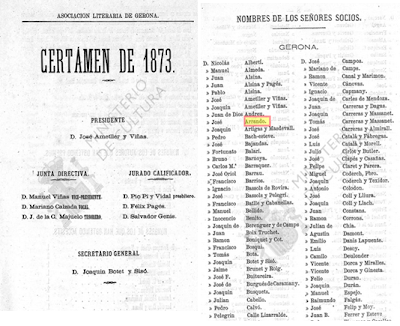 Imágenes de un folleto impreso a causa de un certamen literario que se realizó en 1873 en Gerona. Imágenes de las páginas 1 y 3. José pertenecía al grupo de socios de la sociedad.